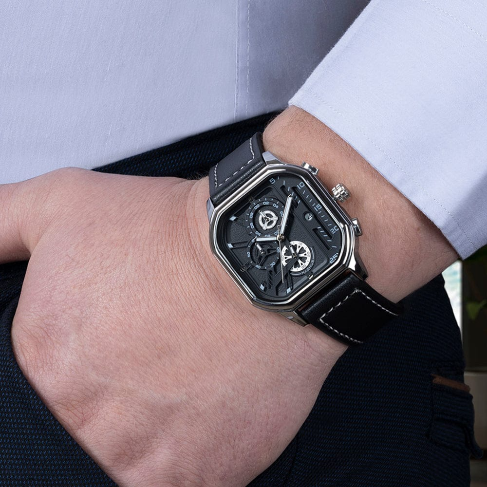 Featuring a distinctive square dial and refined color combinations, the ASTRA 211 brings a bold yet tasteful aesthetic to your wrist. The custom 3D-modeled face is not only a visual statement but houses multifunction displays 24-hour indicator, day of the week, and stopwatch all easily controlled via stainless steel side buttons.